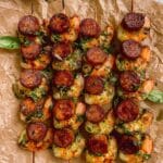 These Herb Grilled Shrimp and Chorizo Skewers combine succulent shrimp marinated in a fresh basil-cilantro herb oil with spicy Spanish chorizo, then grilled to juicy perfection. This quick and flavorful recipe is perfect for summer grilling, offering a zesty and aromatic dish served with a drizzle of herb oil and fresh lime wedges.