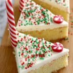 Christmas Sheet Cake is a tender and moist vanilla sheet cake baked in a large rimmed pan, then topped with smooth cream cheese frosting and decorated with festive holiday sprinkles, candy canes, and peppermint candies to resemble charming Christmas trees. Perfectly sized for holiday parties or cookie platters, these cut-out treat triangles combine classic flavors with a fun seasonal presentation.