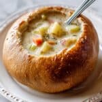 Thick, creamy soups like clam chowder, broccoli cheddar, or chili work best because they won’t leak and sog up the bread too quickly. But feel free to get creative—my family also loves loaded baked potato soup in bread bowls!