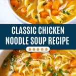 This classic Chicken Noodle Soup combines tender rotisserie chicken, homemade or store-bought egg noodles, and a flavorful broth simmered with fresh vegetables and herbs. Made from scratch with a comforting blend of celery, carrots, garlic, and chicken stock, this hearty soup is perfect for a nourishing meal that’s both satisfying and easy to prepare.