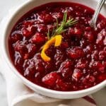 For holiday dinners, I like to serve this cranberry sauce in a small glass jar or a pretty crystal bowl to showcase its gorgeous jewel-red color. A sprig of fresh rosemary or thyme tucked on the side adds an elegant and festive touch. If you’re hosting brunch, dollop it atop cream cheese spread on bagels—it’s always a crowd-pleaser!
