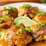 This Honey Lime Pan Roasted Chicken is a quick and flavorful dish featuring juicy, bone-in, skin-on chicken thighs cooked to golden perfection in a skillet. The chicken is coated with a tangy and sweet honey-lime-soy sauce glaze, garnished with fresh green onions and lime slices, making it perfect for weeknight dinners or meal prep. The recipe balances sweet, savory, and citrus notes while maintaining a tender texture through pan roasting.