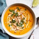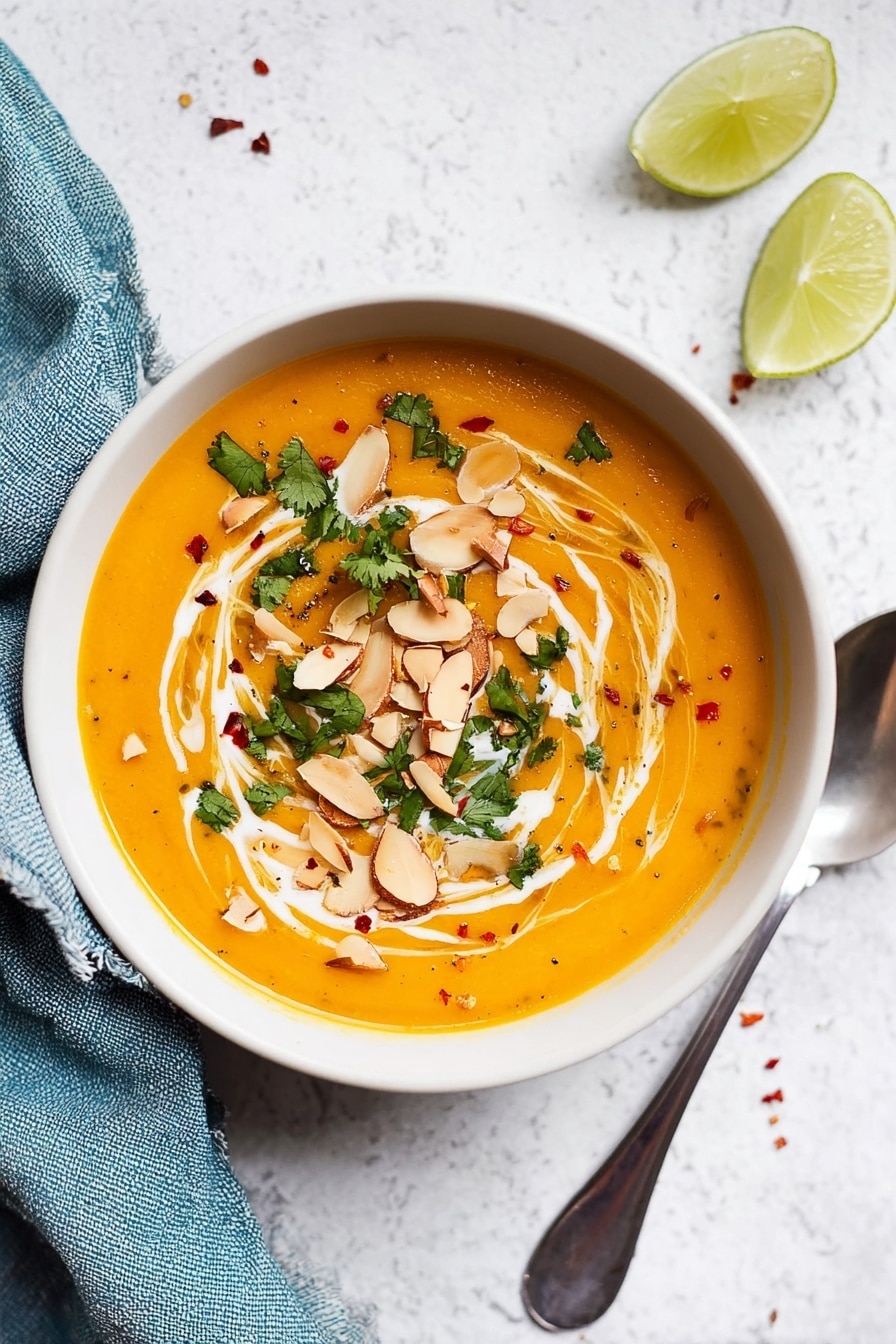 - Serve and Garnish: Divide the soup among bowls. Garnish with roasted sliced almonds or peanuts, chopped cilantro, a drizzle of extra coconut milk if desired, and a sprinkle of red chili flakes for a bit of heat.