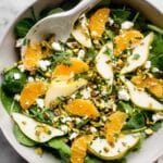 Irish Salad, also known as Irish Flag Salad, is a fresh and vibrant dish featuring layered colors reminiscent of the Irish flag with spinach, pears, oranges, feta cheese, pistachios, and fresh basil, all tossed in a light citrus vinaigrette.