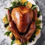 - Serve Turkey: Carve turkey if desired and arrange on platter with fresh herbs and citrus garnishes. Serve with homemade gravy on the side.
