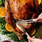 I usually top my carved turkey with some extra fresh chopped herbs like parsley and a few lemon wedges on the side to add brightness. A sprinkle of flaky sea salt just before serving brings the skin’s flavor home perfectly. Plus, those roasted garlic halves make a delicious and mild accompaniment for guests to spread on their slices.