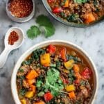 A hearty and flavorful lamb, lentil, and squash stew packed with warming spices and fresh vegetables. This comforting dish combines tender lamb mince, green lentils, butternut squash, and cavolo nero in a rich, spiced tomato broth, perfect for a nourishing family meal. Easily adaptable to vegetarian by omitting the lamb, it uses simple ingredients to create layers of taste and texture.