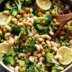 - Toss Pasta and Veggies: Add the drained pasta to the skillet with the garlic and olive oil, stirring to coat the pasta evenly. Then add the roasted broccoli florets and chickpeas. Squeeze the juice and add the zest of 1 lemon directly into the skillet. Season with salt and pepper to taste. Toss everything together gently until well combined and heated through.