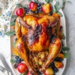 These ingredients come together to create a juicy turkey with a crispy, shiny maple glaze that’s not too sweet but absolutely delightful. Some fresh herbs and fruits play a starring role to infuse the meat with flavor from the inside out—just don’t skip them!