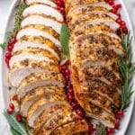 - Serve: Slice the turkey breast and arrange on a serving platter. Garnish with optional pomegranate seeds, cranberries, garlic, or fresh herbs for a festive and attractive presentation. Serve and enjoy!
