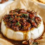 - Assemble the topping: Spoon the pecan mixture evenly over the top of the scored brie wheel, then drizzle any remaining syrup from the bowl over the pecans and brie for extra flavor.