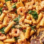 Marry Me Shrimp Pasta is a luscious and flavorful dish featuring large shrimp cooked in a rich sun-dried tomato cream sauce with baby spinach and Italian seasoning, tossed with perfectly cooked rigatoni or penne pasta and garnished with fresh basil and Parmesan cheese. This dish combines hearty proteins and greens with a creamy, tangy sauce, making it a comforting yet elegant choice for any dinner.