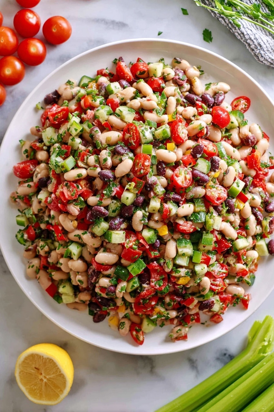 A hearty and flavorful Mediterranean Dense Bean Salad packed with protein, fiber, and fresh vegetables. This no-cook recipe combines chickpeas, black beans, and cannellini beans with crisp veggies, tangy feta, and a zesty lemon-oregano dressing. Perfect for a quick, nutritious lunch or easy meal prep.