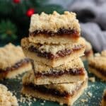Delightfully delicious mince pie crumble bars featuring a rich homemade mincemeat filling made with a mixture of dried fruits, spices, and brandy, sandwiched between a buttery oat crumble base and topping. Perfect for festive occasions or cozy treats.
