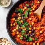A hearty and flavorful Moroccan chickpea stew featuring aromatic spices, sweet potatoes, tomatoes, and olives, perfect for a warming vegan and gluten-free meal served over couscous or quinoa.