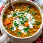 This Moroccan Lentil Soup is a hearty and flavorful dish that combines tender brown lentils with aromatic spices like cinnamon, cumin, and harissa paste. Enhanced with fresh vegetables and finished with a dollop of creamy Greek yogurt and fresh parsley, this comforting soup is perfect for a nutritious and warming meal.