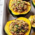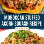 This Moroccan Stuffed Acorn Squash recipe blends tender roasted acorn squash with a flavorful filling of seasoned ground beef, bulgur wheat, golden raisins, and toasted pine nuts. Infused with warm spices like cumin, cinnamon, nutmeg, and paprika, it offers a comforting and hearty meal perfect for chilly evenings. The stuffing is cooked on the stovetop and then baked inside the squash halves until golden and heated through, resulting in a deliciously balanced dish that’s both nutritious and satisfying.