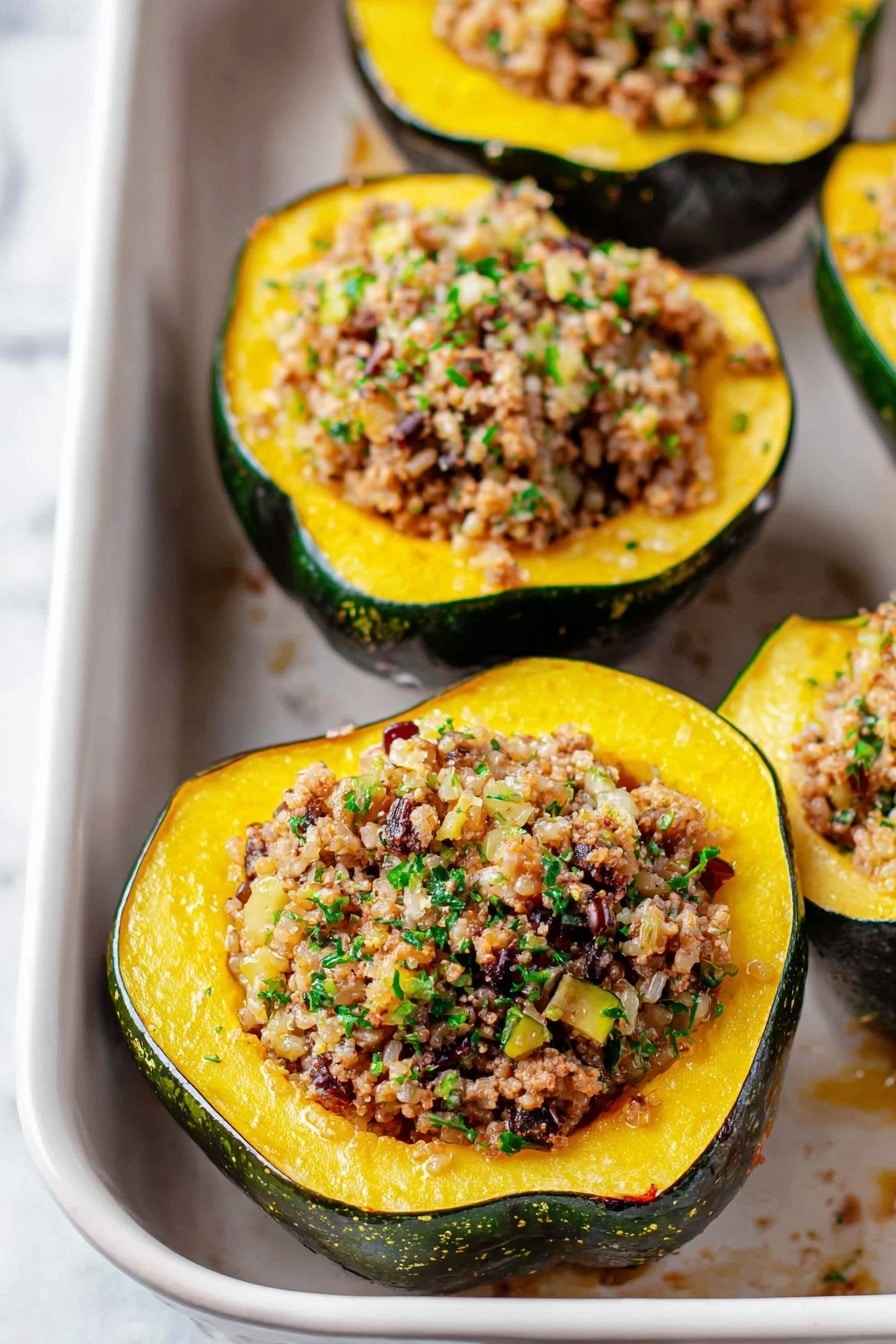 Start by preheating your oven to 400°F (200°C). Place the halved and seeded acorn squashes cut side down in a baking dish. This helps the flesh steam beautifully inside the skin while roasting. Roast them for about 35-40 minutes until the squash is fork-tender but still holds its shape nicely. You’ll know it’s just right when the skin is firm, but the flesh yields easily to gentle pressure.