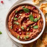 - Serve and Garnish: Transfer the dip to a serving plate. Use the back of a spoon to create decorative waves on the surface. Drizzle with good-quality olive oil and garnish with the reserved finely chopped walnuts, fresh mint leaves, and pomegranate seeds.