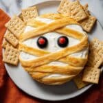 Once out of the oven, use two mini pepperoni slices and place them into two black olive slices to create your mummy’s eyes. I find this really brings the whole look together and is such a cute touch that invites smiles. Serve immediately with your favorite crackers or sliced baguette, and watch as everyone digs in.