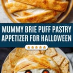 Mummy Brie is a fun and festive appetizer perfect for Halloween or any gathering. This recipe features a wheel of creamy brie wrapped in flaky puff pastry strips to resemble a mummy, baked until golden and gooey. Topped with mini pepperoni and sliced black olives to create spooky mummy eyes, it’s a playful and delicious dish that is sure to impress your guests.