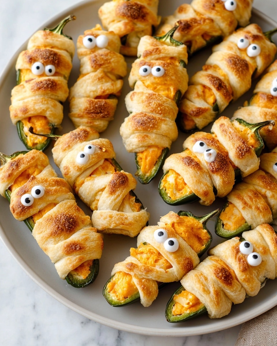 These Mummy Jalapeno Poppers are a festive and delicious appetizer perfect for Halloween or any party. Creamy cheese-filled jalapenos are wrapped in a homemade tangy yogurt dough, baked until golden, and finished with candy eyes for a fun spooky touch. They offer a perfect balance of creamy, spicy, and savory flavors with a delightful flaky crust.
