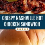 This Nashville Hot Chicken recipe features boneless, skinless chicken thighs coated in a spicy, crunchy breading and fried to golden perfection. The chicken is topped with a fiery cayenne butter sauce that balances heat with a hint of sweetness, then served on a soft burger bun with tangy pickles for the ultimate spicy fried chicken sandwich experience.
