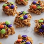 - Shape the cookies: Using a medium cookie scoop, portion out about 1.5 tablespoons of the sticky mixture onto parchment or wax paper. If desired, sprinkle Halloween-themed sprinkles on top and press a few M&Ms into each cookie for decoration.