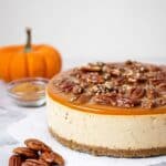- The caramel pecan topping can be made a day ahead and refrigerated; rewarm slightly before topping the cheesecake if needed.