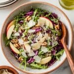 Since this salad has fresh greens and apples, I generally avoid freezing it—it changes the texture noticeably. However, you can freeze cooked farro separately to have on hand for quick salad assemblies later!
