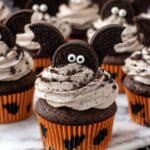 These are best served cold or at room temperature, so reheating isn’t really needed. If your chocolate melts a bit, just pop them in the fridge for 10 minutes to reset. Avoid microwaving as that can cause the Oreo cream to get too soft and the candy eyes to melt or warp.