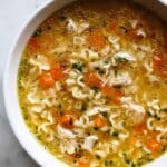 This soup freezes well, but here’s my trick: freeze the broth and chicken separately from the pasta. That way, you keep the texture intact. When you’re ready, thaw and reheat the broth and chicken, then cook fresh pasta and add it in just before serving.
