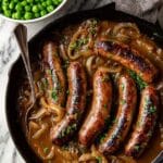 - Serve: Plate the cooked sausages and generously spoon the onion gravy over them. Serve immediately with creamy mashed potatoes and peas. For a low-carb option, use creamy cauliflower mash instead of potatoes.