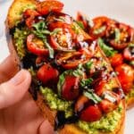 - Crisp golden brown baguette slices are topped with a flavorful basil pesto, then a simple tomato bruschetta topping and drizzled with a sweet and tangy balsamic glaze.