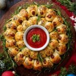 - Garnish and Serve: For added festive presentation, tuck fresh rosemary sprigs around the wreath. Place a bowl of ketchup or your preferred dipping sauce in the center and serve warm.