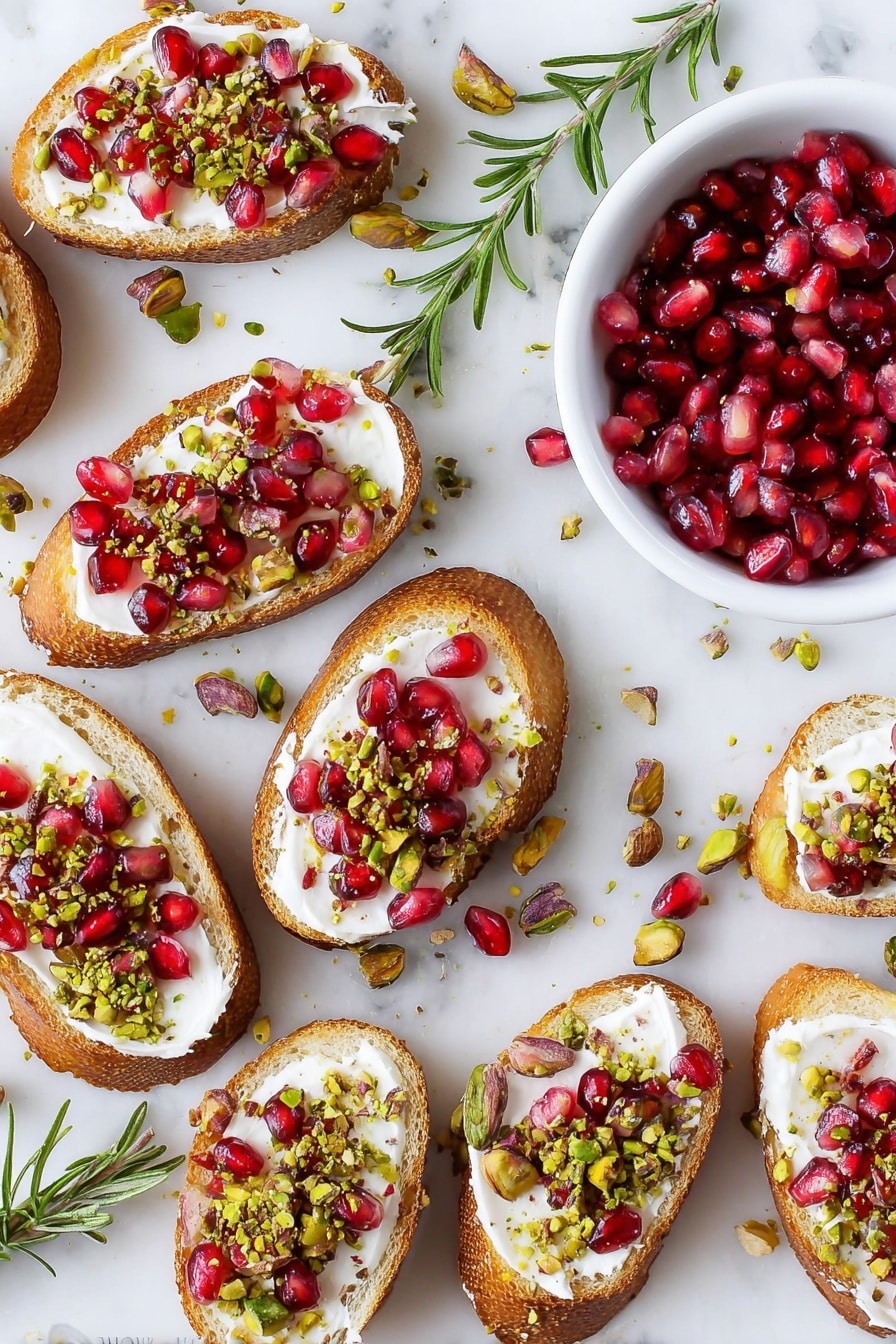 - Add Toppings: Carefully top each crostini with a generous amount of pomegranate arils and sprinkle chopped pistachios over the cheese layer to add texture and flavor.