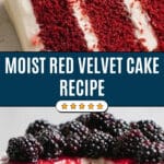 This Red Velvet Cake with Blackberry Cream Cheese Recipe relies on classic ingredients for the cake, but the star here is the fresh blackberries in the cream cheese frosting. I always recommend using fresh blackberries for the best authentic flavor, and the coffee in the batter really makes the red velvet flavor pop.