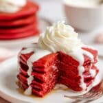- Serve: Plate the warm red velvet pancakes and generously drizzle with the cream cheese glaze. Enjoy immediately for the best flavor and texture.