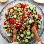 - Combine all ingredients: Add the diced cucumbers, tomatoes, red onion, and chickpeas into the bowl with the dressing. Toss everything together thoroughly so the flavors meld evenly.
