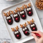 - Add Antlers: Position two mini pretzels above the eyes on each cookie to resemble antlers, pressing gently to secure.