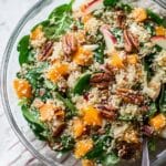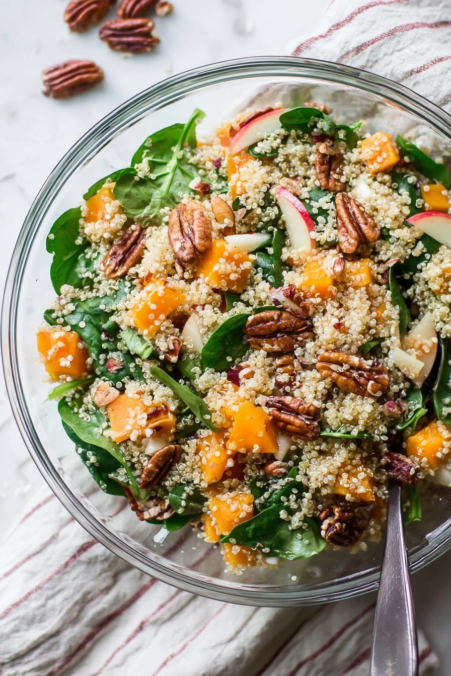 - Assemble salad: In a large bowl, combine the cooled quinoa, roasted butternut squash, spinach, diced apple, chickpeas, and toasted pecans. Toss gently to mix.