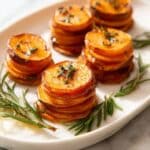 Deliciously tender and flavorful Roasted Sweet Potato Stacks made with thinly sliced sweet potatoes, fresh rosemary, and a buttery olive oil mixture. These visually appealing stacks roast to perfection in the oven with a lovely balance of soft, moist interiors and slightly crisp, browned edges, making them a delightful side dish for any meal.
