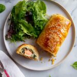 Salmon En Croûte, also known as Salmon Wellington, is an elegant and flavorful dish featuring fresh salmon fillets wrapped in buttery puff pastry with a creamy herb and horseradish filling. This recipe combines tender salmon, a spinach and cream cheese mixture, and a zesty horseradish sauce, making it perfect for special occasions or sophisticated dinners.