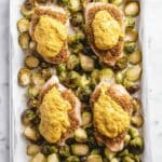 This Whole30 and Keto-friendly Sheet Pan Jamaican Chicken recipe features tender chicken breasts seasoned with flavorful Jamaican jerk spices, roasted alongside crispy brussels sprouts, and finished with a fresh mango salsa topping. Easy to prepare and clean up, this dish is perfect for a healthy, hearty weeknight dinner or meal prep.