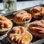 Cut your dough log into 6 to 8 rounds and place each into a cupcake liner. I like to gently press each round with the palm of my hand to compact it to about half its original thickness; this ensures they bake evenly and develop that golden crust we’re aiming for. Sprinkle any leftover cinnamon sugar on top before sliding the tray into the oven for 25-30 minutes until deep golden and irresistible.