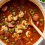 This Shrimp and Sausage Gumbo is a hearty, flavorful one-pot stew that combines the rich flavors of a caramelized roux, smoky sausage, tender shrimp, and fresh vegetables. This classic Cajun dish is perfect for a comforting meal and is best served over rice to soak up the aromatic, spicy broth.