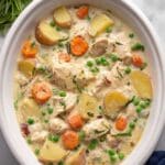 Once the potatoes are fork-tender, remove the chicken and shred it with two forks. Stir the shredded chicken back into the slow cooker along with frozen peas and Parmesan cheese. The residual heat melts the cheese just right, adding creaminess and flavor. Give it a final taste and adjust salt or pepper if needed.