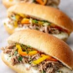 Slow Cooker Italian Chicken Sandwiches are an easy and flavorful meal featuring tender shredded chicken thighs slow-cooked with Italian seasonings, pepperoncini, and giardiniera. Perfect for a comforting weeknight dinner or game day, these sandwiches are served on toasted hoagie buns with melted provolone cheese and tangy spicy toppings.