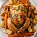 The magic of this slow roasted whole chicken recipe comes from fresh herbs and root vegetables, which create a beautiful aroma and flavorful base. Each ingredient complements the others perfectly, so no need to overcomplicate the shopping list!
