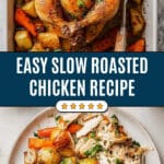 This Slow Roasted Chicken recipe features tender, juicy chicken roasted at a low temperature for several hours, infused with fresh herbs, lemon, and garlic. The chicken is cooked on a bed of aromatic vegetables, resulting in flavorful meat and a delicious base for gravy. Finished with a high-heat blast to crisp the skin, it makes an easy yet impressive meal perfect for family dinners.